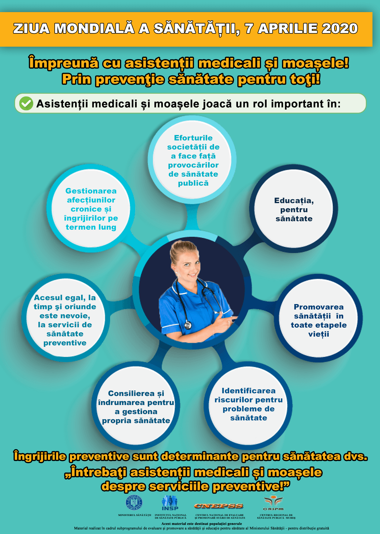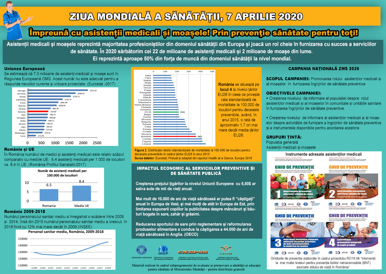 Anul acesta în centrul atenției sunt asistenții medicali și moașele. Ziua Mondială a Sănătății este despre rolul lor în furnizarea îngrijirilor de sănătate preventive. Asistenții medicali și moașele reprezintă majoritatea profesioniștilor din domeniul sănătății din Europa și joacă un rol cheie în furnizarea cu succes a serviciilor de sănătate. Pe 7 aprilie 2020 sărbătorim 22 milioane asistenți medicali și 2 milioane de moașe din întreaga lume!