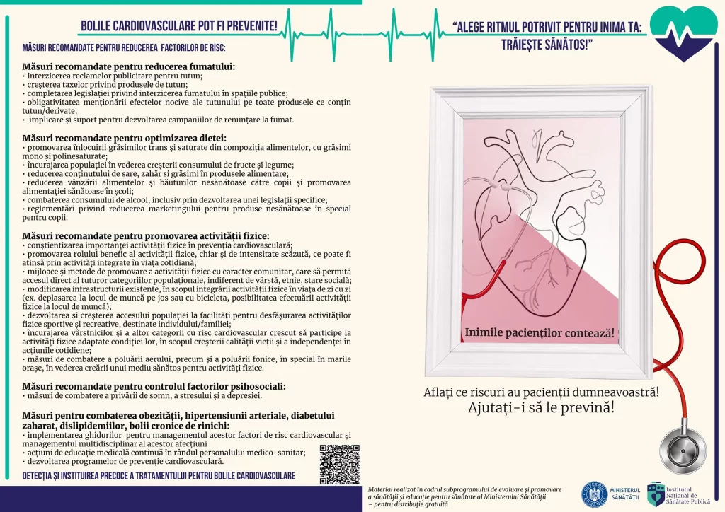 Institutul Național de Sănătate Publică reiterează faptul că renunțarea la fumat, reducerea cantității de sare, consumul de fructe și legume în cantitate optimă, activitatea fizică regulată și evitarea consumului excesiv de alcool, reduc semnificativ riscul apariției bolilor cardiovasculare.